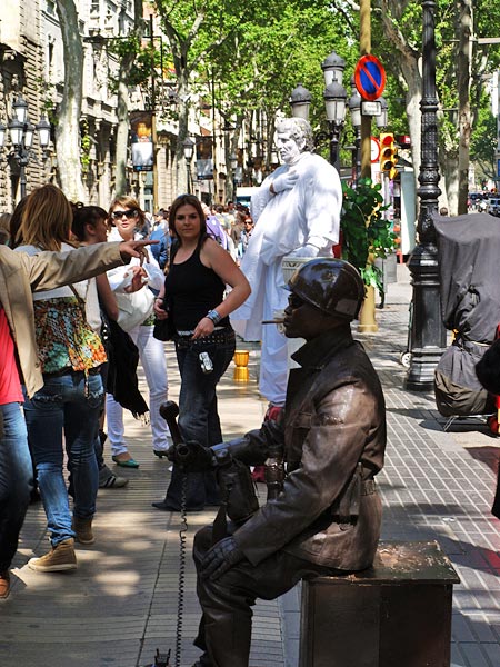 Пройдя по бульвару Колумба (Пассе де Колон) и осмотрев памятник великому и загадочному мореплавателю (Колумб по-испански "Колон"), очутились на бульваре Рамбла, где пробивались против течения мощного потока проснувшихся барселонцев, накануне долго была плохая погода, а тут солнце и еще суббота к тому же, тянет погулять.