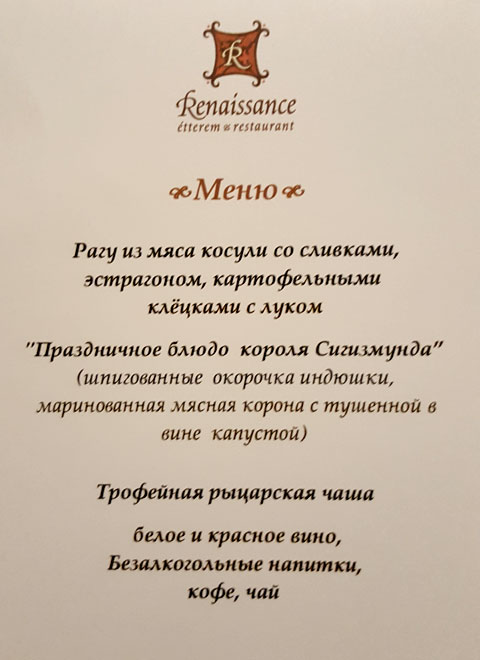 меню ужина в ресторане "Ренессанс" в Вышеграде с глиняной посудой,