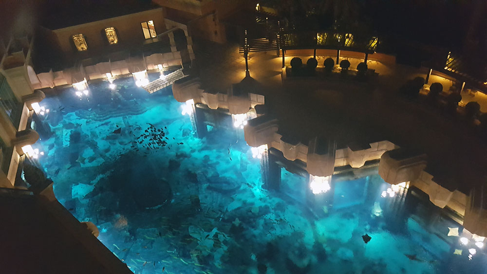 В номере нас с Машей встречал "комплимент": бутылка красного вина, фирменные конфеты с надписью на коробке "Атлантис" и большое блюдо с фруктами. Но самая интересная фишечка ожидала нас на балконе: внизу сверкал лазурью знаменитый огромный, этажа в четыре высотой, открытый аквариум. Это было сильное впечатление: прямо под нами плавали акулы, скаты и косяки всякой мелочи. Вспомнилась фраза Жоржа Милославского: "Это я удачно зашел!"