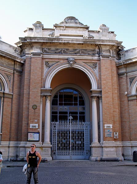 Усыпальницу мы видели. Еще, говорят, в Равенне замечательные мозаики, но мозаик мы не видели, как и храма Сан-Витале и много другого, по Равенне промчались пулей, как и по Сан-Марино, впрочем, тоже. А в Равенне находится много раннехристианских и византийских памятников V-VI вв: мавзолей Галлы Плацидии, гробница короля остготов Теодориха Готского, базилика Сант-Аполлинаре ин Классе. Купол мавзолея Теодориха - из целого куска камня (чашу диаметром 10,5 м и высотой 2,5 м доставили в Равенну морем с другого берега Адриатики, буксируя между двумя кораблями). Видели из автобуса, он стоит на подъезде к Равенне.