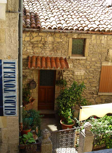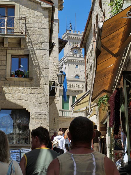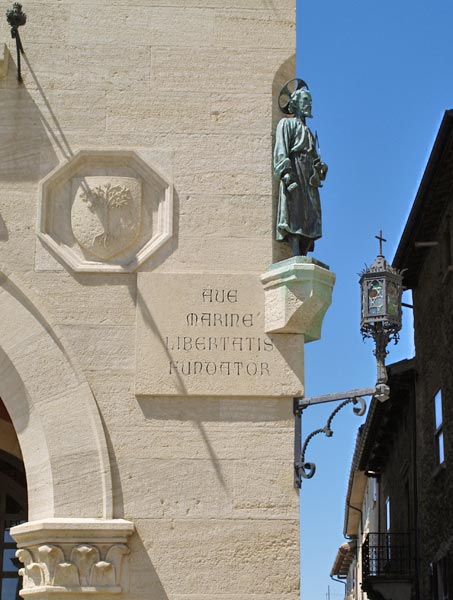 Группу не догнали, но и не расстроились - во второй раз все показалось до боли знакомым, поднялись до центральной площади и сфотографировали св. Марино - небольшую бронзовую фигурку, прилепившуюся к углу здания мэрии.