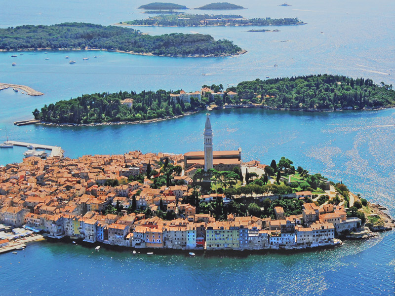 Ровинь (старая его часть), если смотреть на него прямо сверху, похож на оранжевый абрикос, висящий на толстой плодоножке. Снабжен дробным живописным архипелагом из 22-х зеленых островов, сразу за ним - о-в св. Катарины, на фото можно кликнуть.