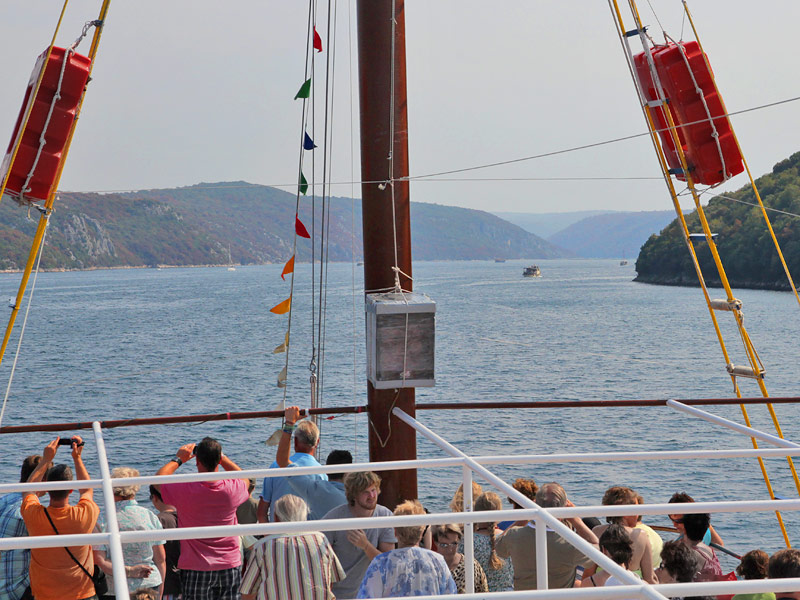 Утром пузатый деревянный корабль, разукрашенный флагами и флажками, с запозданием на полчаса забрал нас из Голубой лагуны, и мы при хорошей погоде отправились на прогулку по маршруту Лимский канал - Ровинь - Врсар.