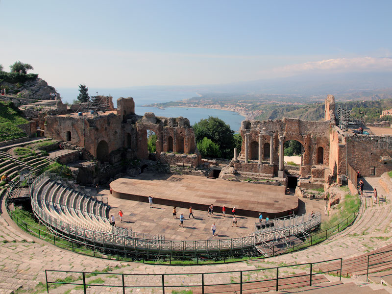 греческий театр. При строительстве греки срыли часть горы для того, чтобы прямо из театра наслаждаться потрясающим видом на горы, море и вулкан. Эстеты... Древние ворота - Порта Мессина - ведут на главную улицу города Корсо Умберто, там, на площади 9 апреля, украшенной цветущими деревьями, находится кафедральный собор XV века и оригинальный фонтан.
