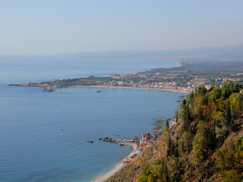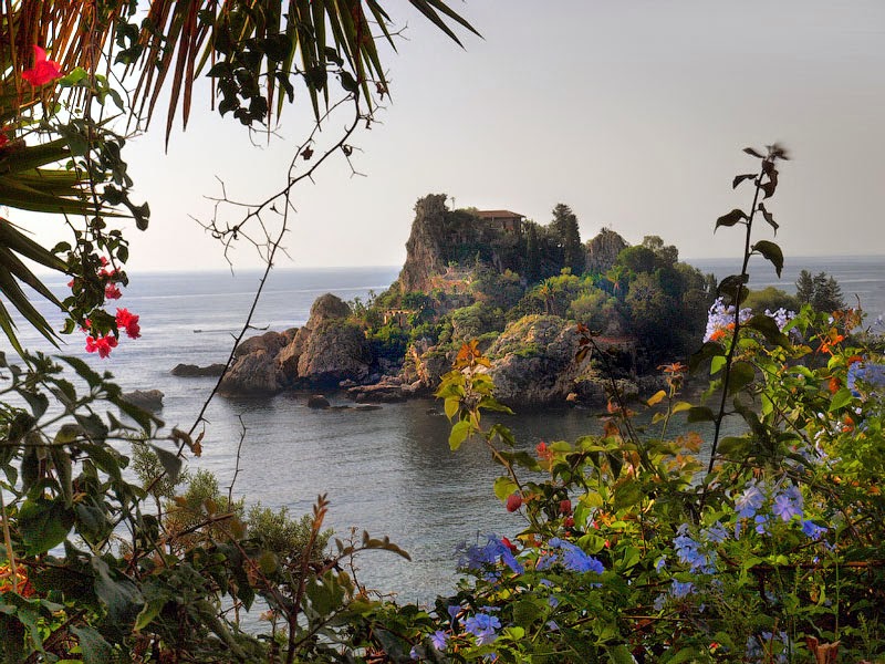 В 4 км серпантина от Таормины, на самой вершине Тауро расположена еще одна достопримечательность - симпатичная деревенька Кастельмола, были мы там когда-то, а у подножия горы - великолепный ("утопает в зелени, абсолютно весь", как пел Миронов в известном фильме) скалистый островок