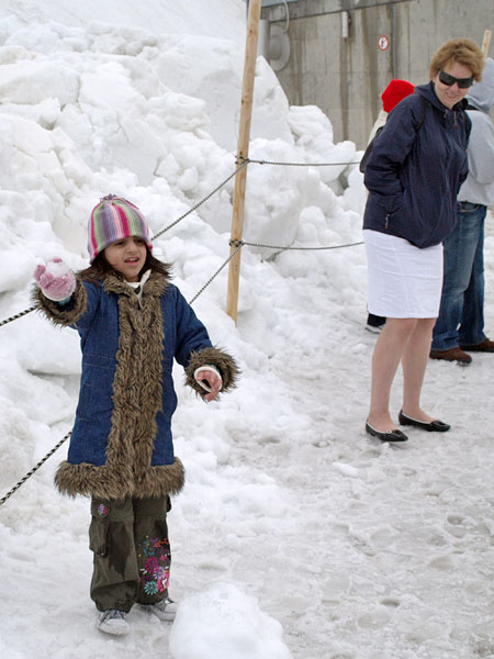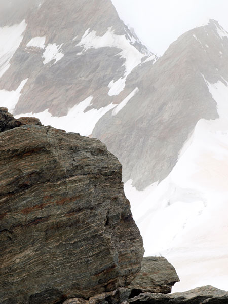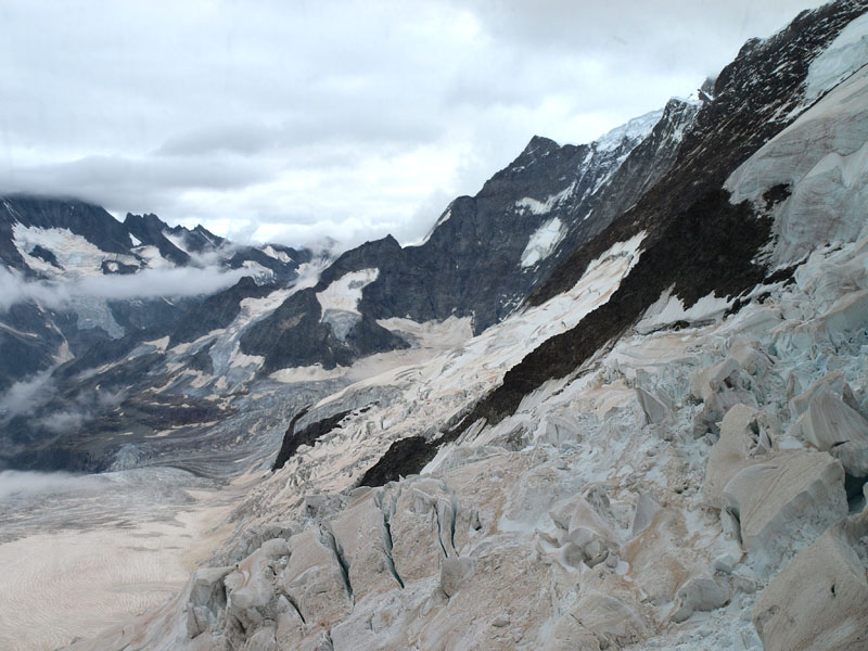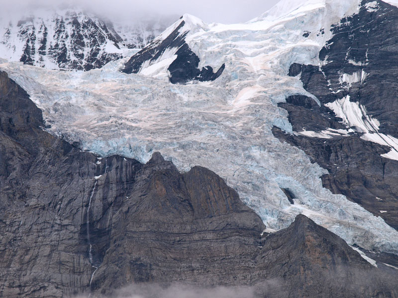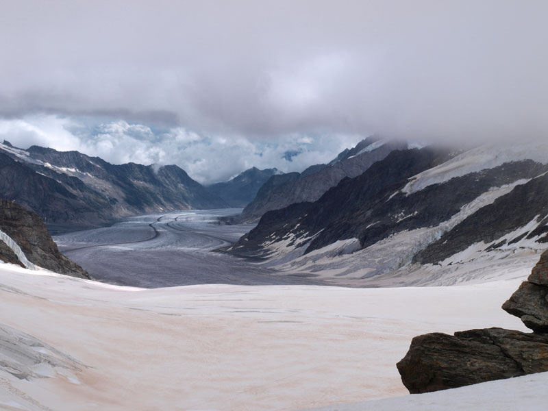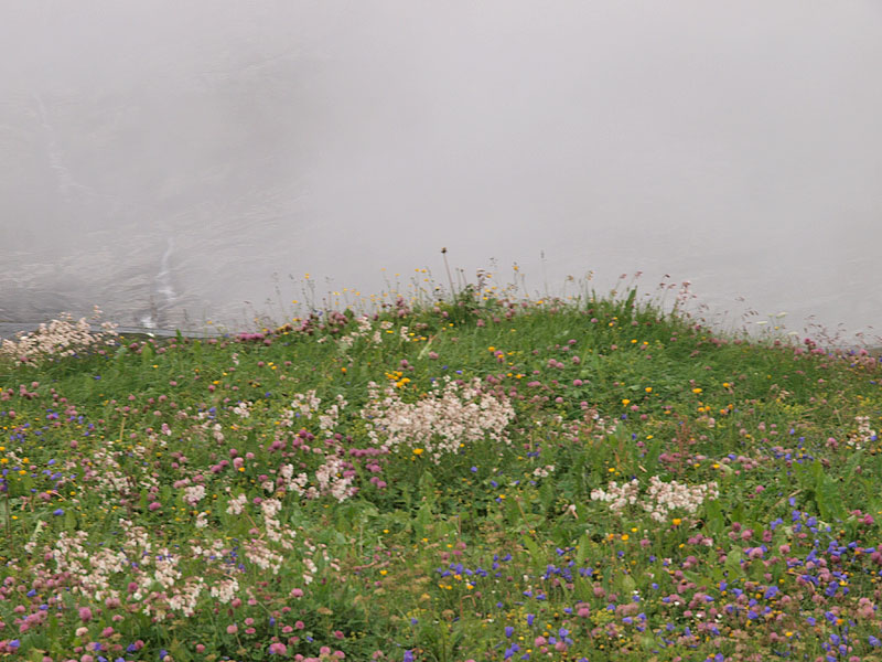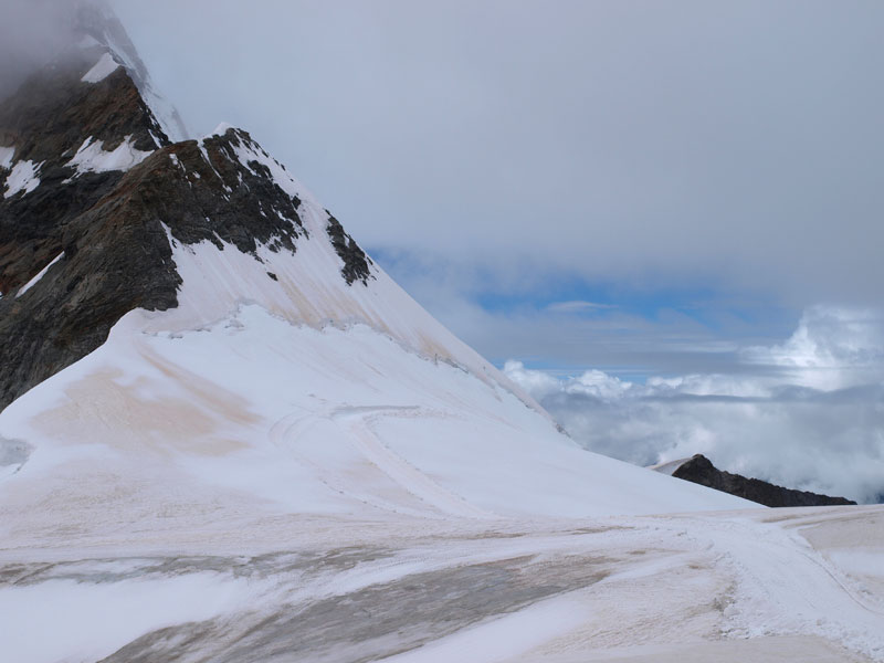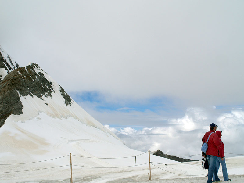 Станция Юнгфрауйох находится в горе, там же можно зайти в ледовый дворец, вырубленный в леднике. Идти туда немного жутковато - узкие лабиринты, скользкий ледяной пол, кое-где подсвеченные ледяные фигуры. Скоростной лифт поднимает еще на сто метров, туда прилетают альпийские галки с желтыми клювами, подкормиться у туристов. Но при нас была сильная облачность, вся смотровая площадка наверху была как будто закрашена белой краской снаружи. Так что галок я не видел, а вот ледник и облака под ногами - это да!.. И еще ветер.