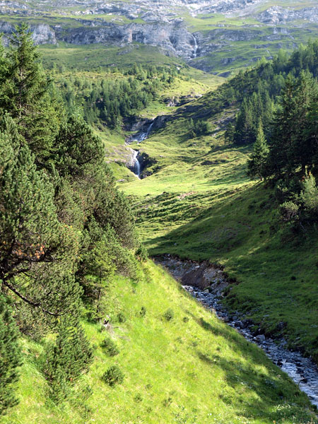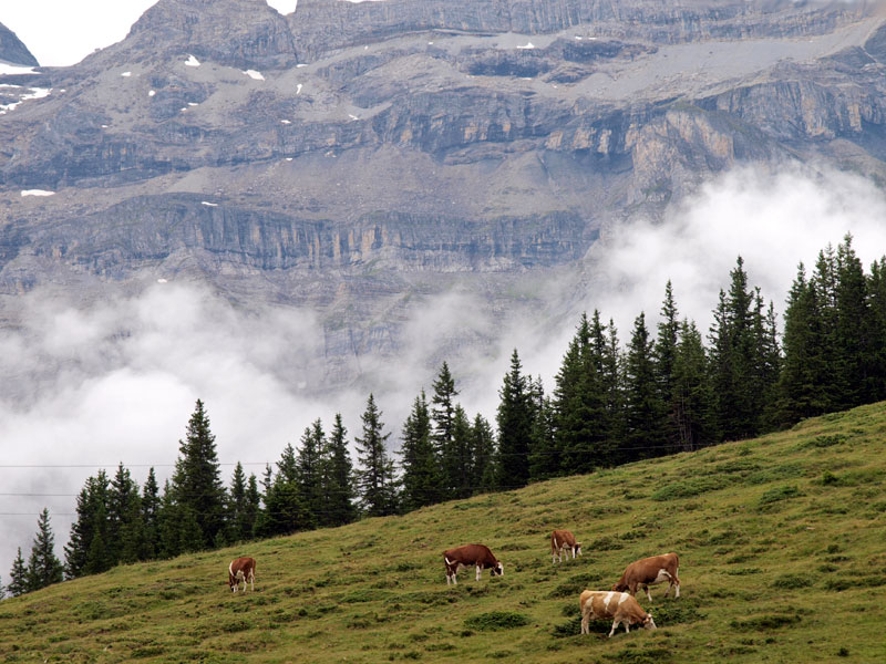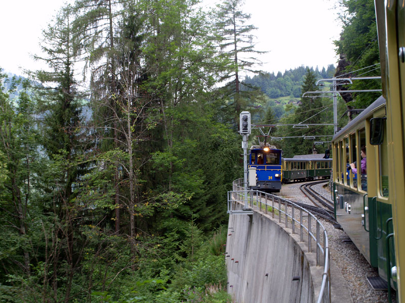 На последнем этапе между обычными рельсами проложен еще один - зубчатый. Так, по реечной передаче и поднимались на вершину. Это - частная дорога, однопутка, на разъездах надо пропустить встречный. Пейзажи здесь, надо сказать, дивные (см. фото), путь проходит по холмам с горными ручьями, лесам, ущельям и туннелям с уклоном градусов 30-35. Леса с грибами и земляникой (поезд идет медленно, поэтому успеваем все рассмотреть) сменяются альпийскими лугами, где швейцарские коровки меланхолично кушают альпийские цветочки, у всех большие колокольчики, я бы сказал - колокола, слышно, как они бренчат.