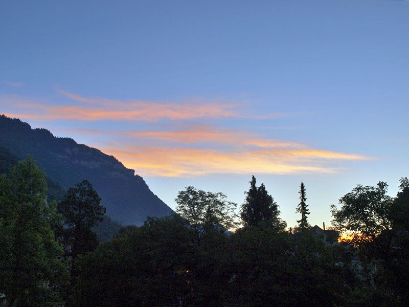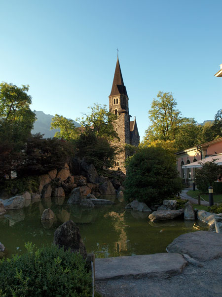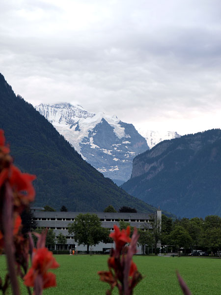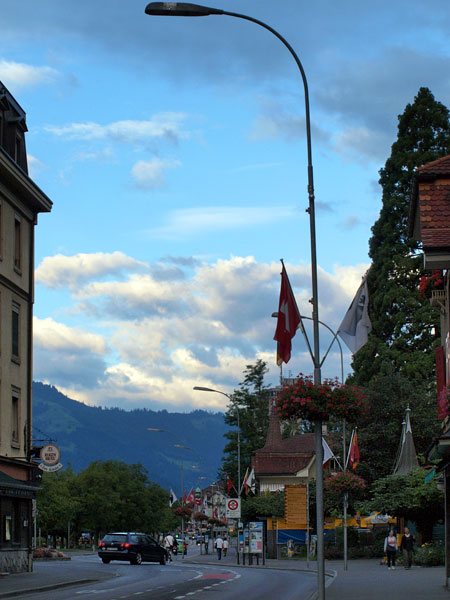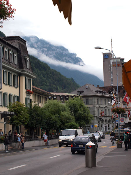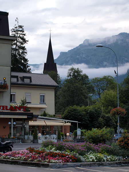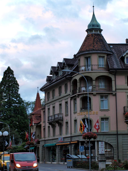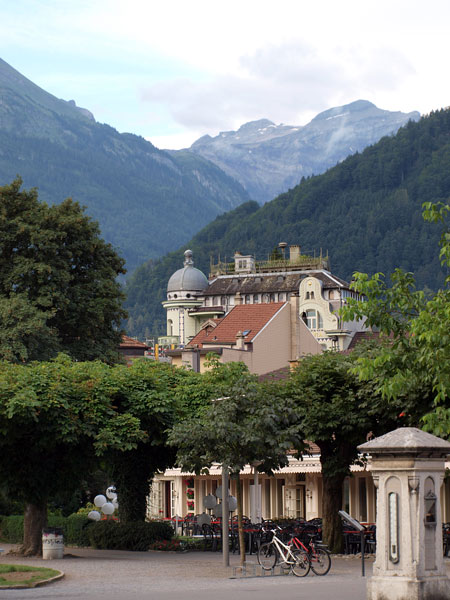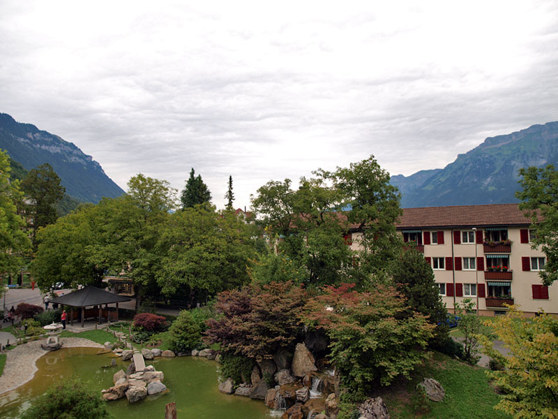 Про Интерлакен в путеводителях написано много и с удовольствием. Все соответствует. В частности, где-то встретилось, что самое красивое место в городе - японский садик. Наши окна на втором этаже выходили как раз на него, отель так и назывался "INTERLAKEN", в нем жили лорд Байрон, написавший "Узника Шильонского замка", в котором мы недавно были, и знакомый всем половозрелым композитор Мендельсон.
