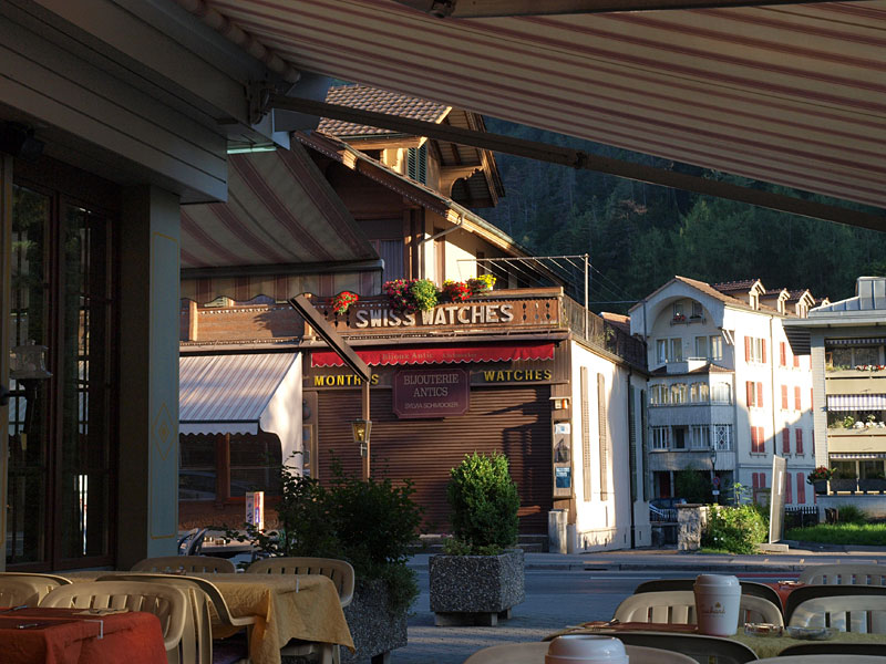 Центральная улица Хехвег, украшенная горными пейзажами, а кое-где и снежными вершинами, изобилует часовыми магазинами, на огромной зеленой лужайке приземляются разноцветные парапланы, в ресторане "Shuh" музыкант поет "Бессаме муччо", аккомпанируя себе на синтезаторе.