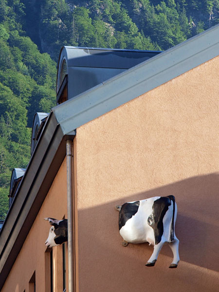 Утром на синем небе сияла снежная вершина капризной Юнгфрау (вот бы сегодня туда!), магазины были закрыты, а задумчивая корова проходила сквозь стену дома. Жаль было уезжать.