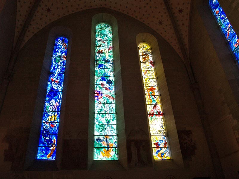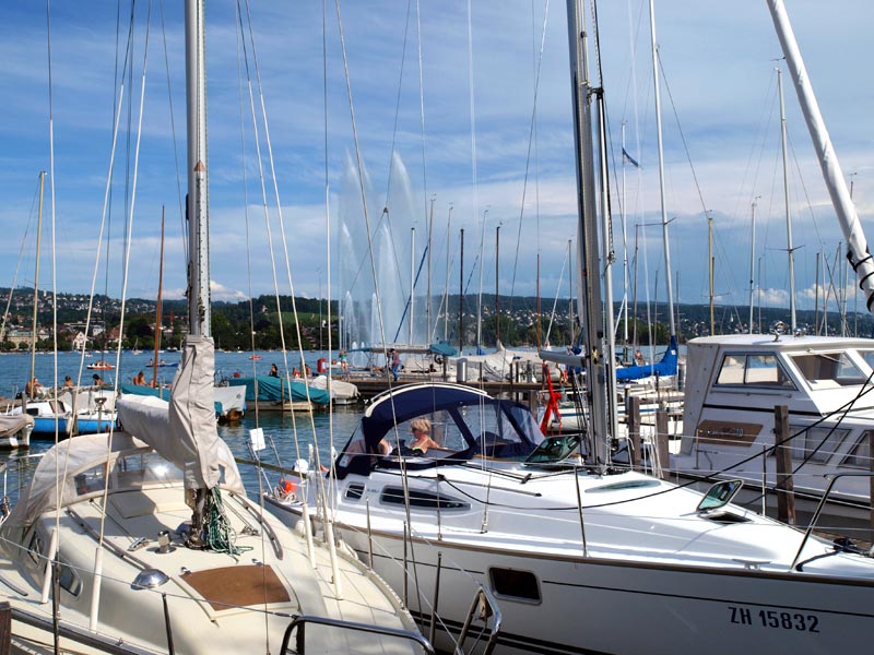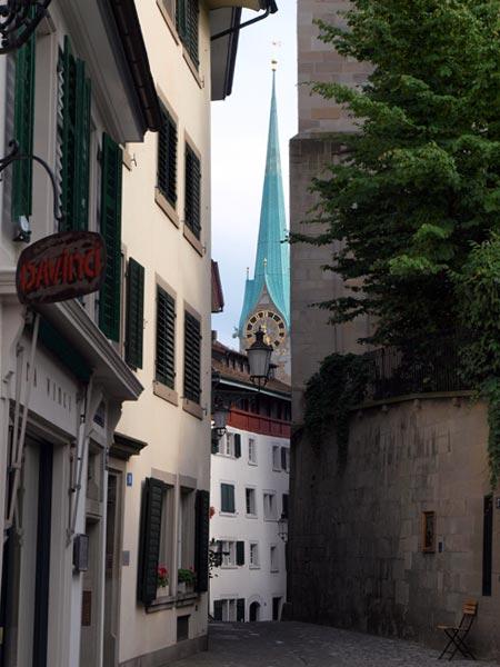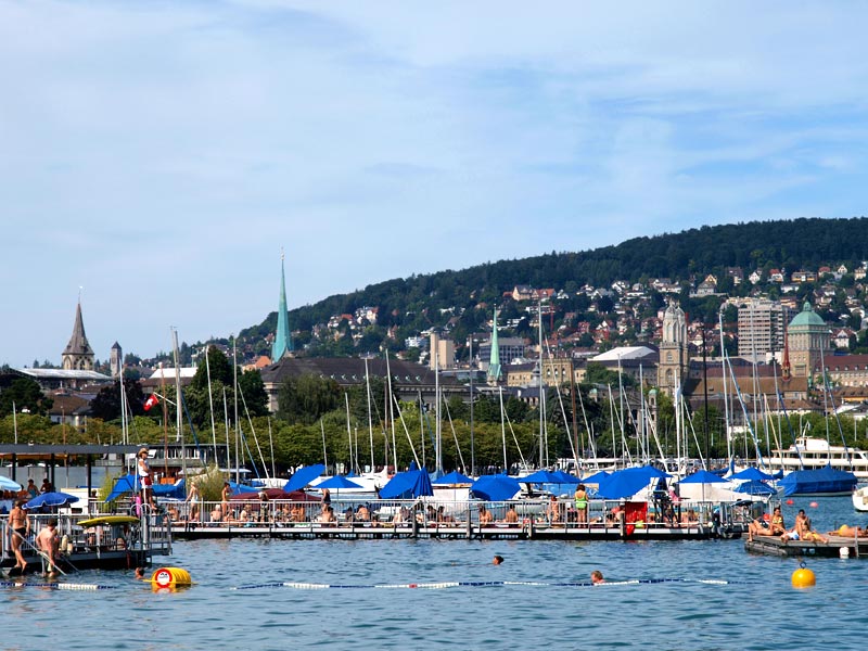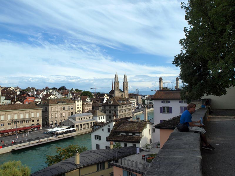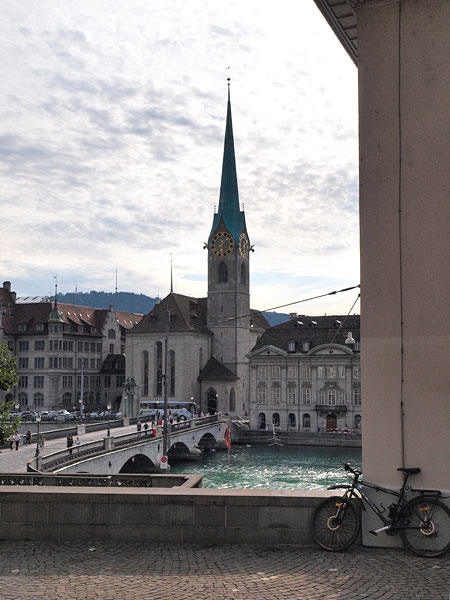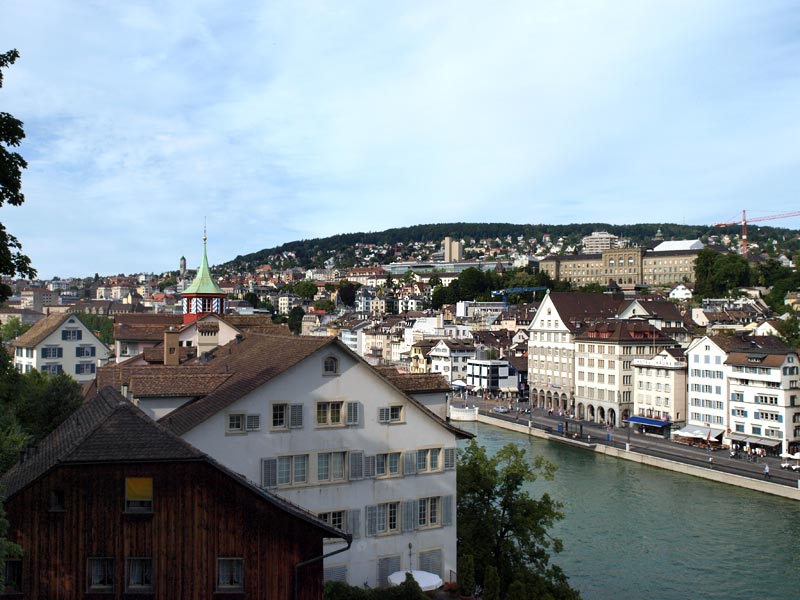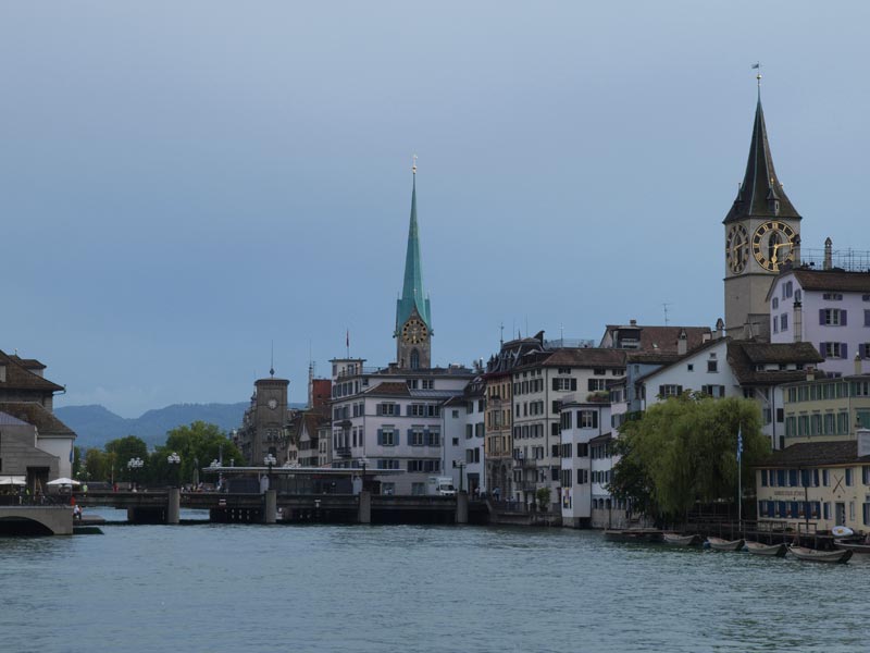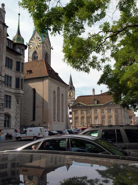 В городе, разумеется, есть Цюрихское озеро и река Лиммат, которая из него вытекает и делит город на старый и современный. Почти со всех концов города видны Кафедральный собор (Гроссмюнстер) с башнями-близнецами, собор св. Петра с башней, на которой самые большие в Европе часы - циферблат более 8м, и Фрауэнмюнстер с витражами, которыми в 1970 году уже сильно пожилой Шагал украсил интерьер этой суровой церкви. Витражи велики, сделаны на скорую руку, мэтр торопился успеть.