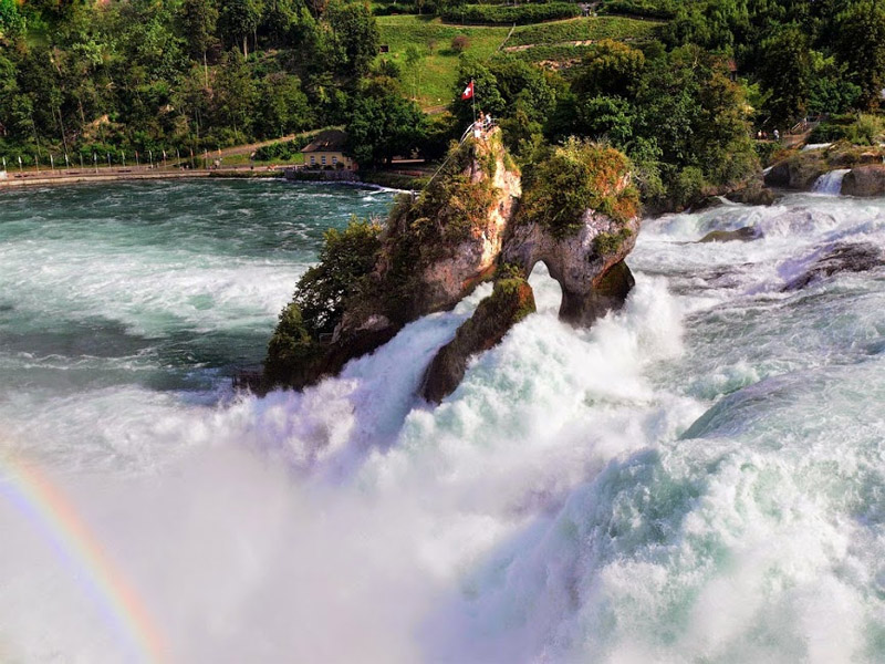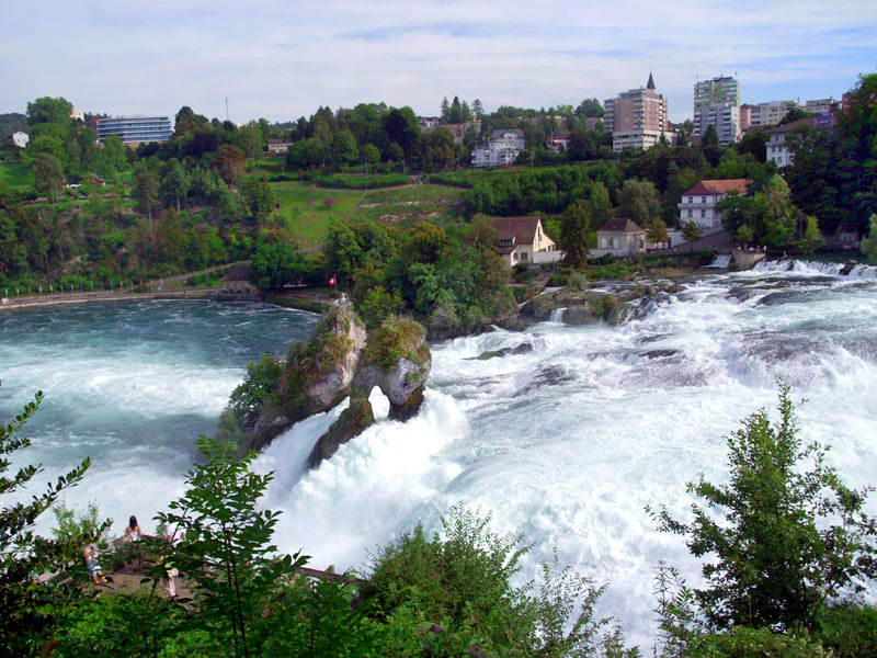 Рейн начинается в Швейцарии, полноводной рекой вытекая из Боденского озера, "Rheinfall" - водопад на Рейне - самый большой в Европе, его ширина 150м, высота - 24м, глубина под свалом 13м. Находится в излучине реки, в его центре находится утес.