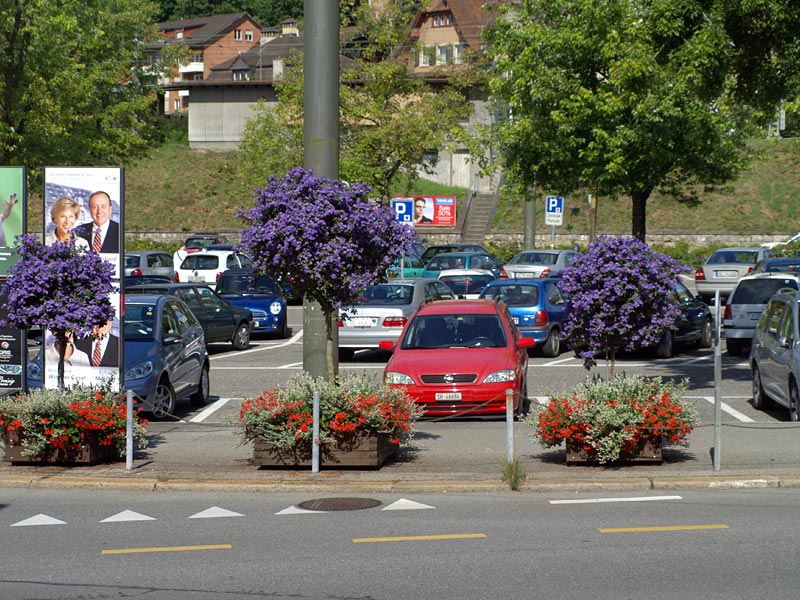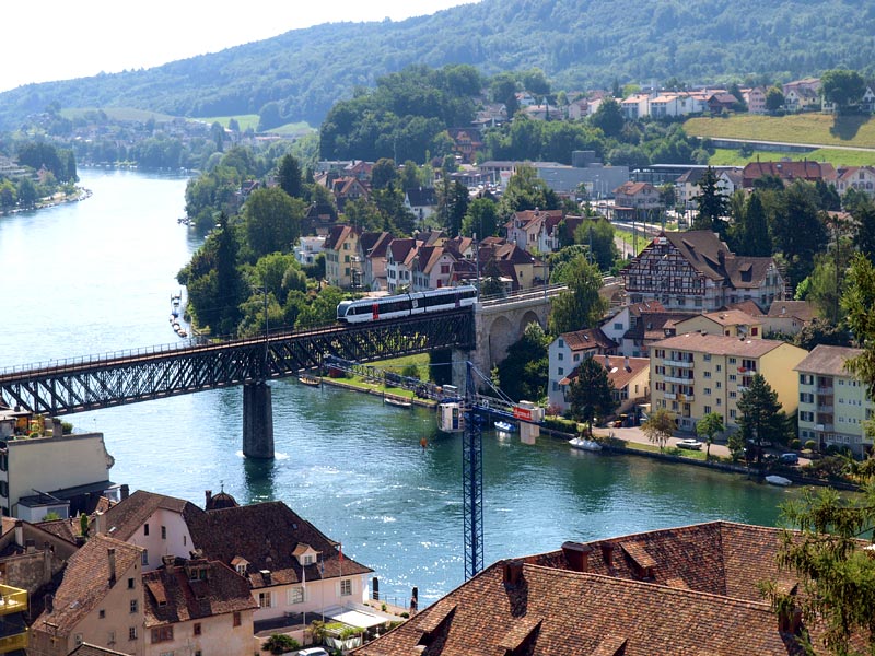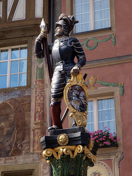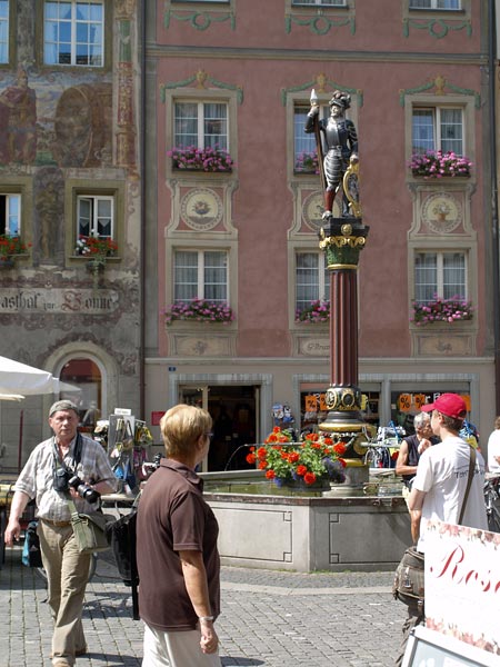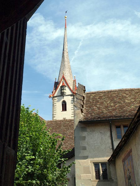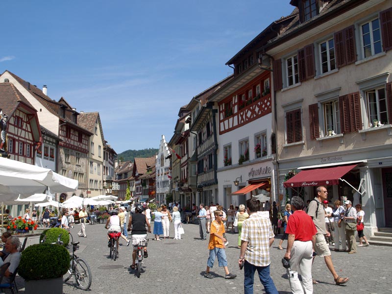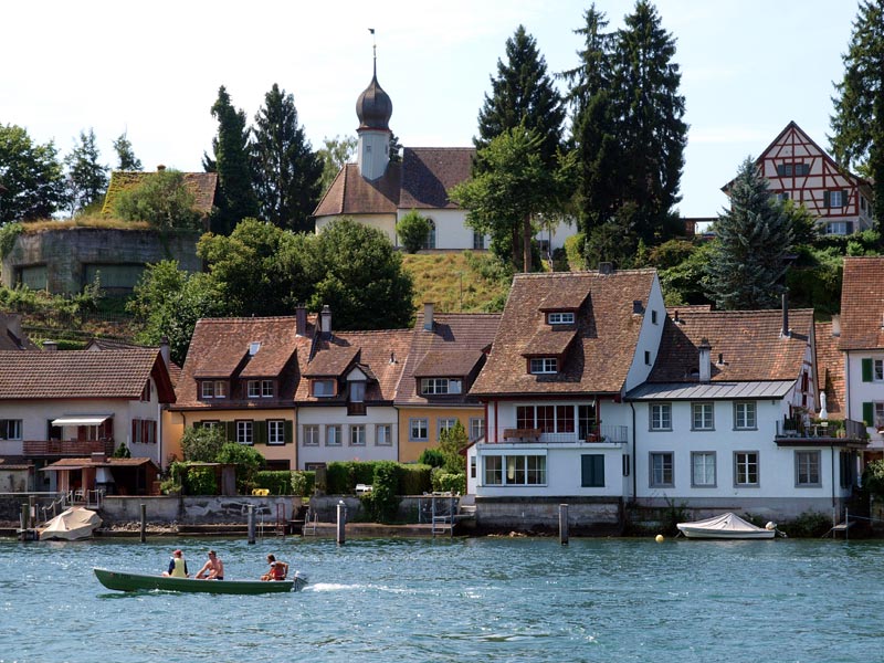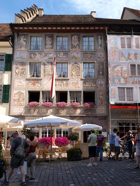 Штайн-ам-Райн (Камень-на-Рейне) - потемкинский поселок городского типа - с расписными домиками, игрушечной площадью с неизменным фонтаном и набережной у изумрудной (как и положено в Швейцарии) речкой (Рейн называется). Дома, впрочем, не фанерные, как у предприимчивого российского царедворца, а натурально фахтверковые. То есть основу их составляет конструкция из деревянных балок и брусьев, заполненных утеплителем и штукатуренные снаружи. Для местного мягкого климата - очень удачная форма домостроения. А для услаждения взора стены покрыты фресками на библейские и охотничьи тематики и увешаны цветами. Очень мило.