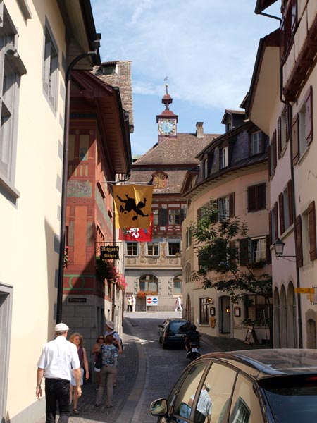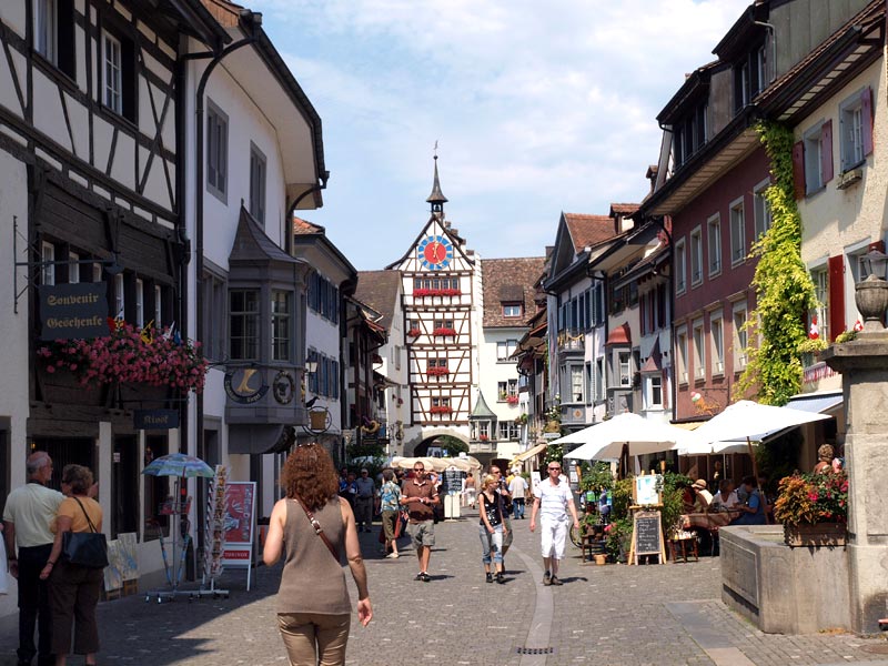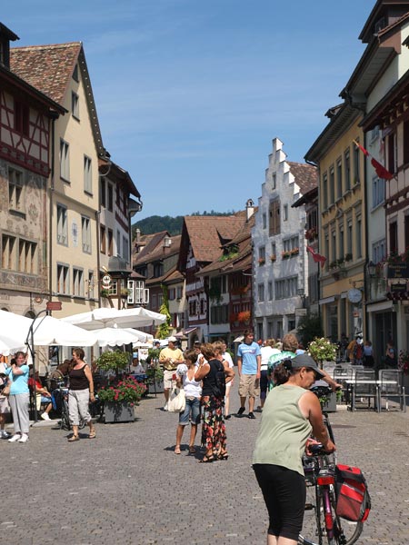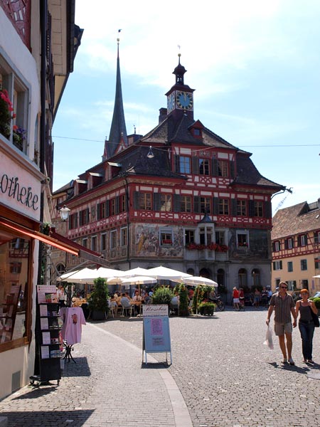 Штайн-ам-Райн - маленький живописный средневековый городок на Рейне рядом с Боденским озером. Фахверковые домики густо уснащены росписями, город живет туризмом, все здесь похоже на декорации.