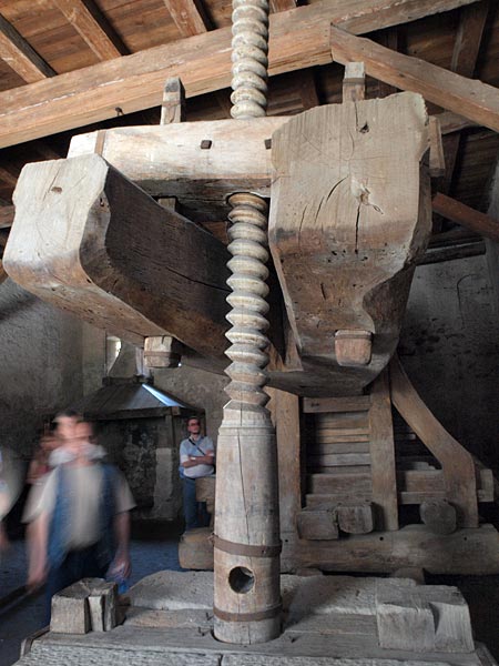 Побродили по набережной и перекусили в ларьке, где хозяин с женой сноровисто жарил колбаски и рыбу и делал салаты оголодавшим туристам. Было и пиво. Хорошая погода и сытый желудок сделали свое дело: нам там понравилось. Особенно впечатлил огромный деревянный пресс, которым оборотистые монахи-бенедиктинцы (монастырь Св. Георгия существует с XII века) давили виноград. В долине Рейна всегда делали хорошее вино.