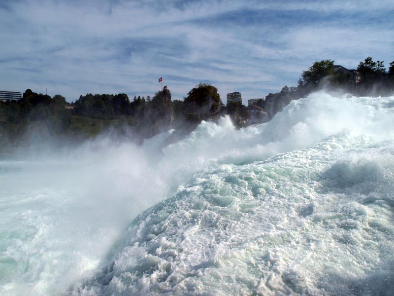 В конце концов, не в этом дело, водопад или перекат, ощутили мощь природы: рев бушующей воды, водяная пыль в воздухе и радуга на солнце в сочетании со спокойной водой зелено-голубого цвета внизу и источенным утесом посреди клокочущей пены вызывали сильные чувства и частые щелчки затворов фотокамер. Велик батюшка Рейн и его рейнский водопад Райнфаль!