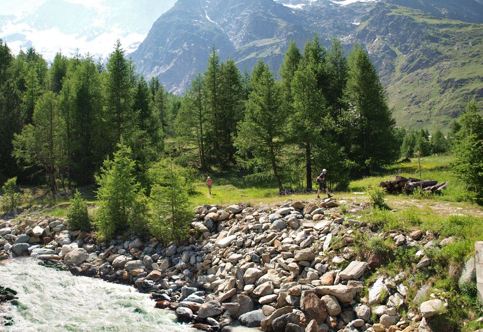 двигались по тропе с полевыми цветами, речками, елями и игрушечными домиками-шале, рассыпанными по всей долине в окружении пиков-четырехтысячников.