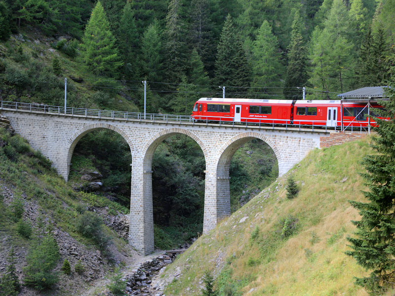 Понедельник – опять хороший завтрак в 07.00. В 10:00 садимся в красный автобус и едем в Италию вдоль озера Комо до Тирано (13:00), там перекусываем и пересаживаемся (в 14:22) на панорамный поезд "Бернина Экспресс" через перевал до швейцарского Санкт-Морица, куда прибываем в 16:22. Отель Eden рядом, но лучше туда добраться на автобусе, потому что круто. В смысле вверх.