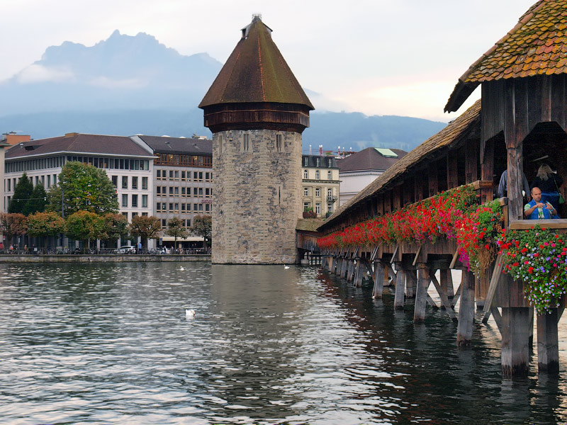 Пятница – вылет из Москвы в 9:25, прилет в Цюрих в 10:50 местного времени, полет около 3,5 часов, разница во времени 2 часа. Аэропорт и вокзал - единый комплекс, мы должны были отправиться в Люцерн в 11:47, но из-за отмены двух поездов смогли выехать только в 13:47, поэтому в Люцерне были только к трем. Нас встречало солнце, лебеди и много китайцев. Отель Hotel de la Paix нашли неподалеку от Капельбрюкке, это - уникальный средневековый крытый деревянный мост через реку Ройс, утопающий в цветах, на фоне горы Пилатус.